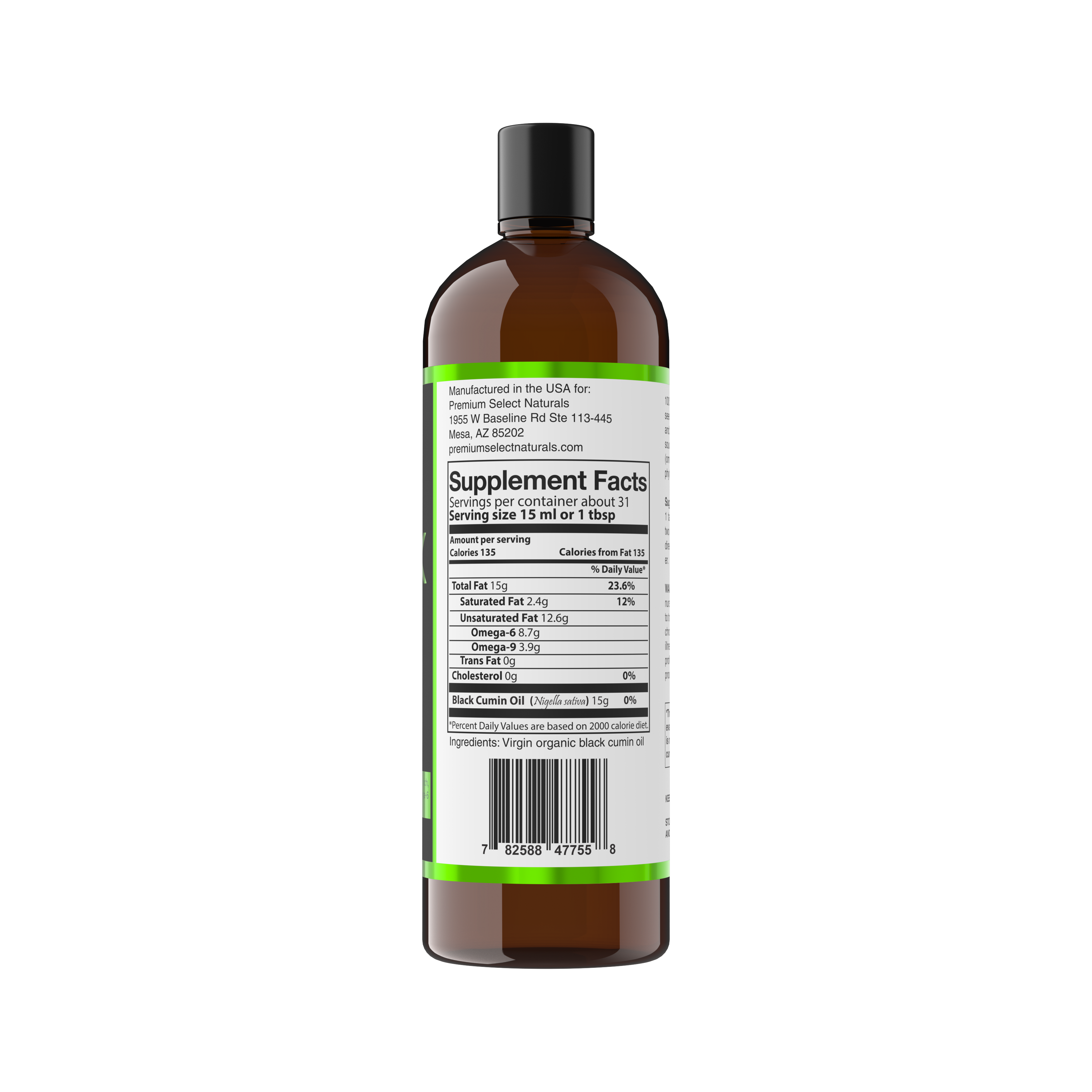 Premium Select Naturals Black seed oil, derived from Nigella sativa, and is renowned for its powerful health benefits, including its anti-inflammatory, antioxidant, and immune-boosting properties. Rich in thymoquinone, it has been shown to support heart health, regulate blood sugar levels, and improve respiratory function. Additionally, black seed oil promotes healthy skin and hair by reducing acne, soothing eczema, and strengthening hair follicles. Its antimicrobial effects also make it beneficial for gut health, aiding digestion and combating harmful bacteria. With a long history in traditional medicine, black seed oil is a natural remedy that supports overall well-being.