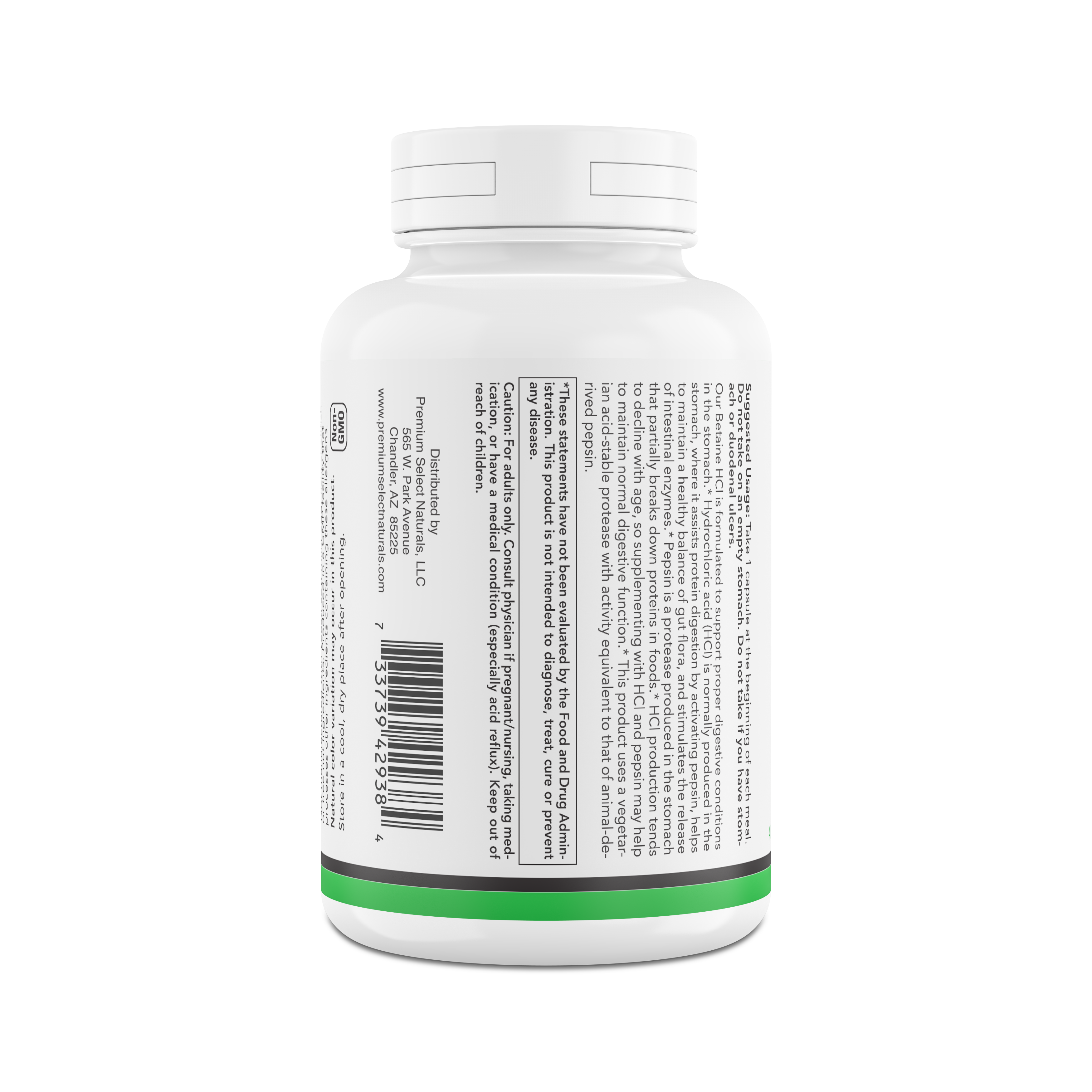Hydrochloric acid (HCl) is normally produced in the stomach. Pepsin is a protease produced in the stomach. HCl production tends to decline with age, so supplementing with HCl and pepsin can help maintain normal digestive function. Premium Select Naturals uses an acid-stable vegetarian protease with activity equivalent to that of animal pepsin.