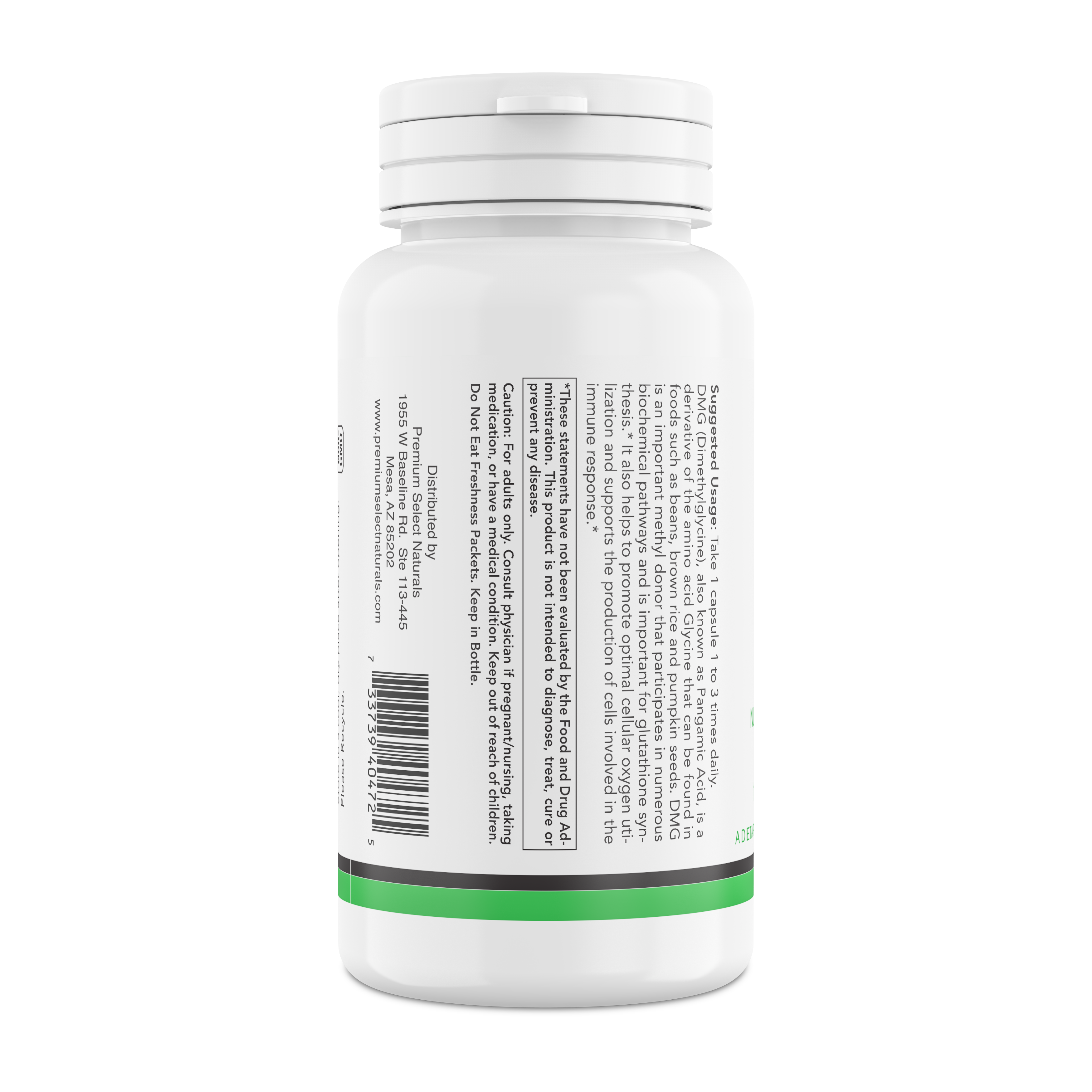 Premium Select Natural’s N Dimethyl Glycine (DMG) is a naturally occurring derivative of the amino acid glycine, known for its versatile health benefits. As a powerful methyl donor, DMG supports a variety of bodily functions, including immune system health, cardiovascular wellness, and enhanced athletic performance. It plays a critical role in energy production and helps promote mental clarity and focus by improving oxygen utilization and supporting cellular function.